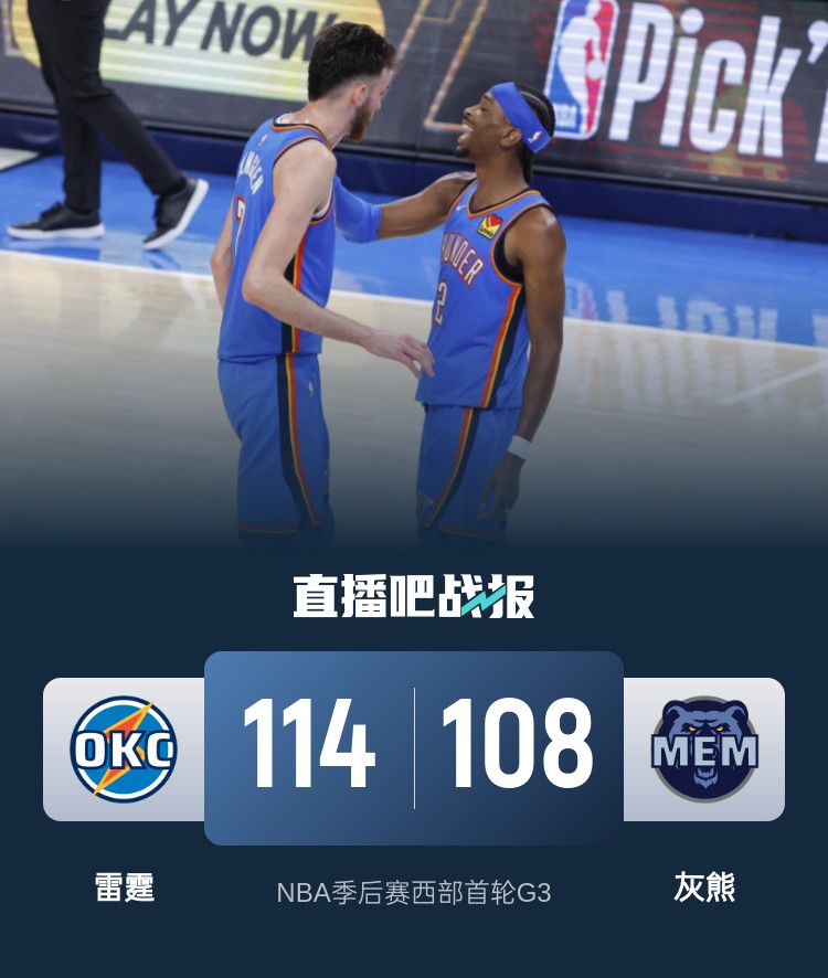 4月25日讯 NBA季后赛首轮G3,灰熊回到主场对阵雷霆。前两场比赛,雷霆在主场都以绝对优势拿下胜利,两场合计净胜70分。