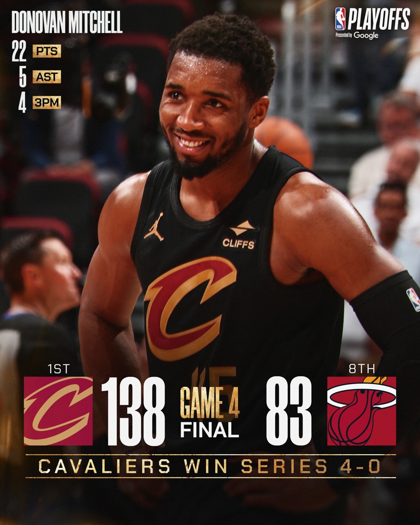 骑士客场以138-83狂胜热火,大比分4-0横扫晋级第二轮,将面对步行者和雄鹿的胜者。此役,骑士最多时曾领先60分,最终净胜55分是季后赛历史上第四大分差胜利。