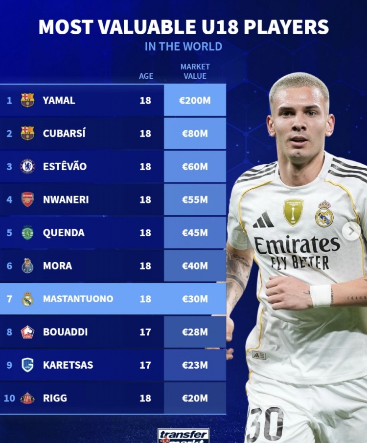 10月1日讯 德转更新世界U18球员身价榜,亚马尔2亿欧高居榜首。