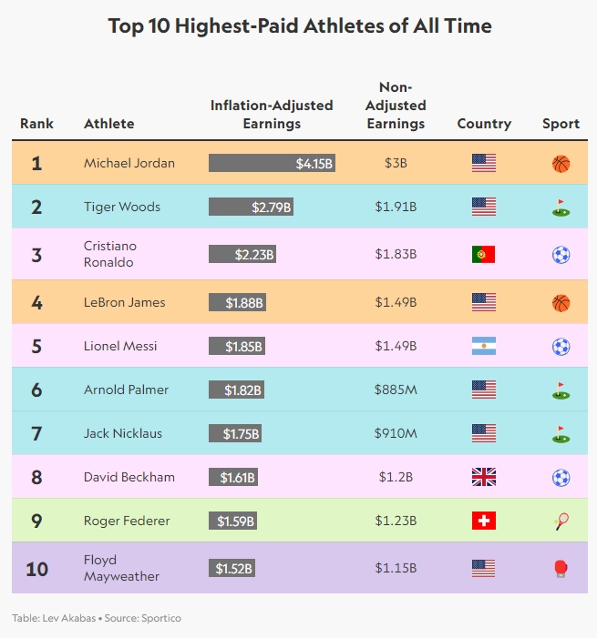 在这份榜单中,迈克尔-乔丹高居榜首,他从1984年成为职业球员以来累计收入达到30亿美元(2024年收入是3亿美元),经通胀调整后是41.5亿美元。