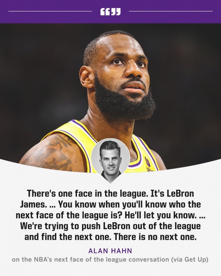 Alan Hahn:“天呐,我们能否就此打住?我们能否停止关于联盟门面的讨论?我们今早就说过这个,只有一个联盟门面,那就是勒布朗-詹姆斯。只要他还在联盟中,他就是联盟门面。你什么时候会知道下一任联盟门面是谁?他会让你知道的。那名球员会很明显。你必须不只是一名出色的球员。我讨厌这么说,因为亚历山大是一名杰出的球员,他可能最终将经历历史上最伟大的赛季之一,集齐得分王、MVP、总决赛MVP,这很罕见,他可以做到那些。但那并不会让他成为联盟门面,我们必须停止这些讨论,而媒体一直在这么做,我们在努力把勒布朗赶出联盟,找到下一任联盟门面。没有下一任联盟门面!