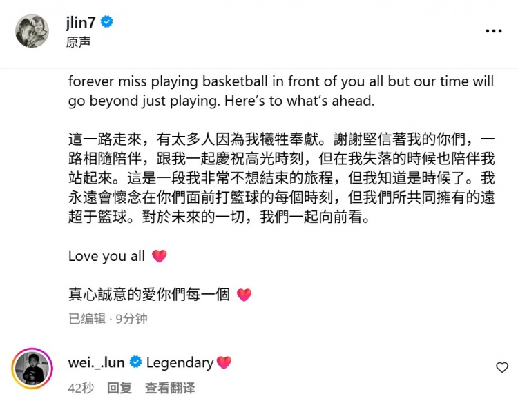 他在社交媒体上发布了这一消息,并写道:“这一路走来, 有太多人因为我而牺牲奉献,多到我无法回报他们。感谢你们所有人对我的信任,一路相伴相随,和我一起庆祝高光时刻,也在我低谷的时候陪我一起站起来。这是一段我非常不想结束的旅程,但是我知道是时候了。我会永远怀念在你们面前打球的每一个时刻,我们之间的记忆已经远超篮球本身,但是是时候让我们一起前进了。对于未来的一切,我们一起向前看。”