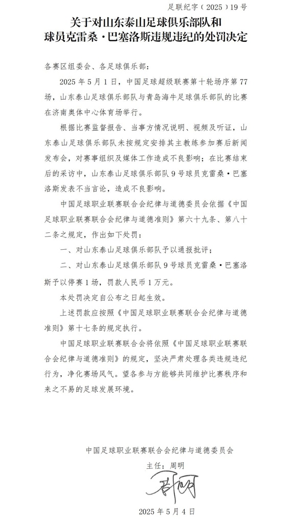 根据比赛监督报告、当事方情况说明、视频及听证,山东泰山足球俱乐部队未按规定安排其主教练参加赛后新闻发布会,对赛事组织及媒体工作造成不良影响;