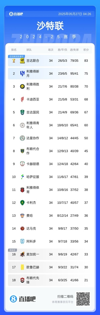 5月27日讯 本赛季沙特联落下帷幕,海港旧将巴尔加斯贡献7球4助攻,帮助哈萨征服保级成功。