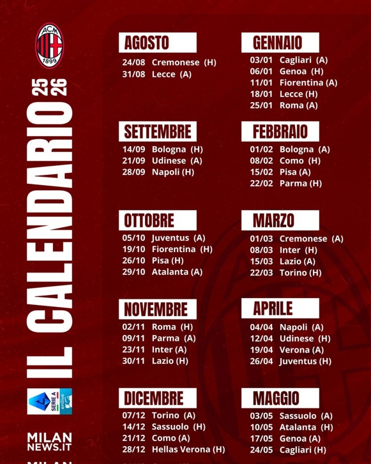 6月7日讯 意甲公布了25/26赛季的赛程,米兰将在第12和28轮对阵国米,第6和第34轮对阵尤文。
