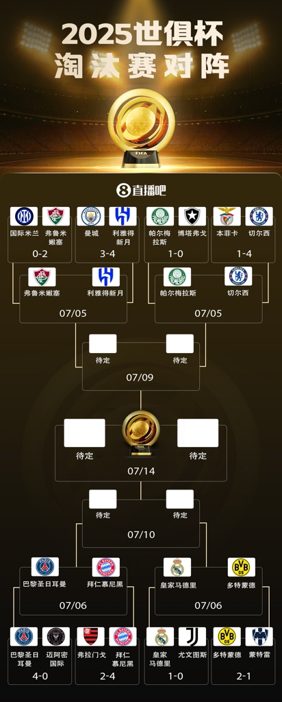 北京时间7月2日,2025世俱杯1/8决赛全部战罢,八强也随之出炉,分别是:弗鲁米嫩塞、利雅得新月、帕尔梅拉斯、切尔西;巴黎圣日耳曼、拜仁慕尼黑、皇家马德里、多特蒙德。小吧推出2025新世俱杯4强和冠军归属预测,你来预言!评论区按照格式首位预测四强正确或者首位预测冠军正确的吧友都将会获得球衣。